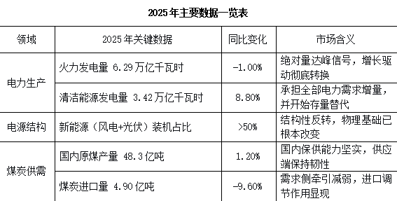 2025年的中國(guó)能源數(shù)據(jù)顯示,電力系統(tǒng)轉(zhuǎn)型已進(jìn)入標(biāo)志性的新階段。全國(guó)規(guī)模以上工業(yè)發(fā)電量同比增長(zhǎng)2.2%,但火力發(fā)電量同比下降1.0%,為歷史首次。與此同時(shí),風(fēng)電和光伏發(fā)電裝機(jī)容量占比首次突破50%,實(shí)現(xiàn)了對(duì)火電裝機(jī)的歷史性超越。在國(guó)內(nèi)原煤產(chǎn)量創(chuàng)新高、進(jìn)口煤量回落的情況下,這些變化預(yù)示著能源基本面與市場(chǎng)邏輯正在發(fā)生深刻轉(zhuǎn)變。