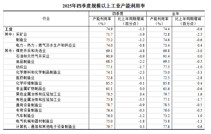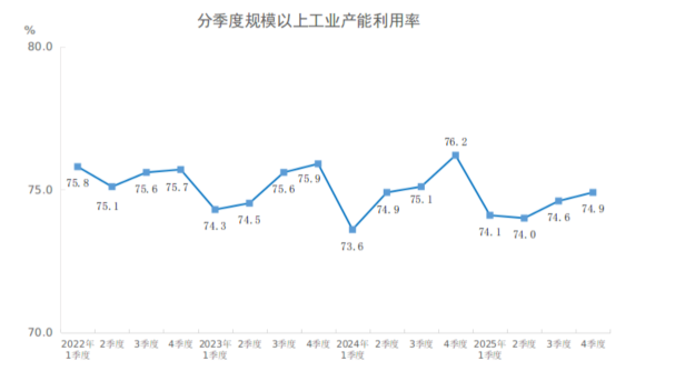 2025年四季度,全國規(guī)模以上工業(yè)產(chǎn)能利用率為74.9%,比三季度上升0.3個百分點,比上年同期下降1.3個百分點。2025年全國規(guī)模以上工業(yè)產(chǎn)能利用率為74.4%。