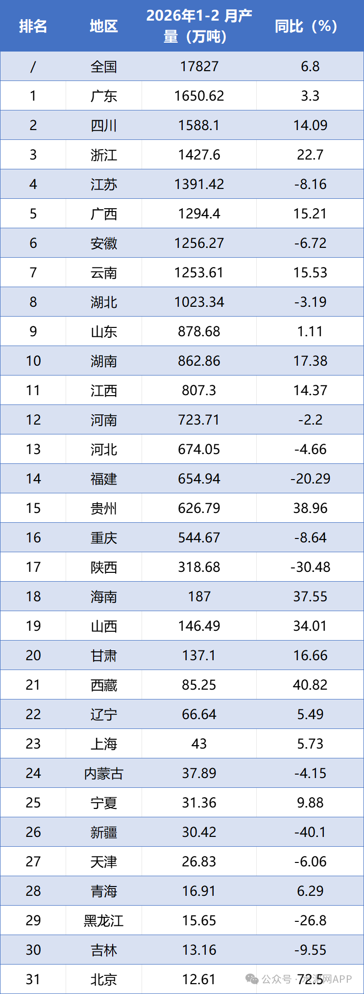 地區(qū)數(shù)據(jù)來看,1-2月,廣東以產(chǎn)量1650.62萬噸位列第一,四川產(chǎn)量1588.10萬噸排在第二,浙江產(chǎn)量1427.60萬噸排在第三。